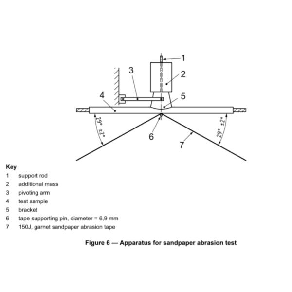 Measure the “resistance to sandpaper abrasion” using 150J garnet sandpaper tape with 5mm to 10mm conductive strips perpendicular to the edge of the sandpaper spaced a maximum of every 75mm. Exert a force of (0.63±0.05)N on the test sample by the combination of the bracket, support rod and pivoting arm, the total vertical force exerted on the test sample shall be the combination of the force exerted by the bracket, pivoting arm, support rod and additional mass. Mount the test sample taut, without stretching, in a horizontal position using an area of the sandpaper abrasion tape not previously used. Place the additional mass and bracket on top of the test sample. Draw the sandpaper abrasion tape under the test sample at a rate of (1500±75)mm/min and record the length of sandpaper abrasion tape necessary to expose the conductor. Move the test sample 50mm and rotate the test sample clockwise 90°. Repeat the procedure for a total of four reading. The mean of the readings shall determine the resistance to sandpaper abrasion.